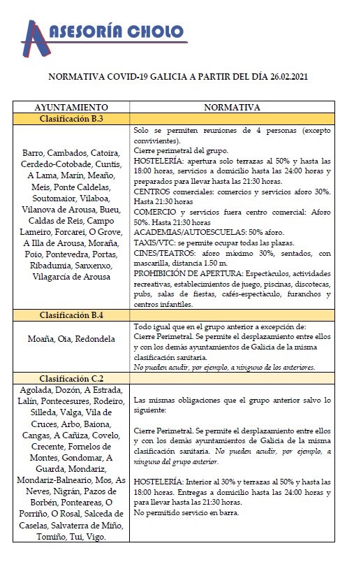 Con fecha 26 de febrero de 2021 entran en vigor nuevas medias ANTI COVID-19 de Xunta de Galicia, cuyas novedades más importante les resumimos en los cuadros adjuntos.